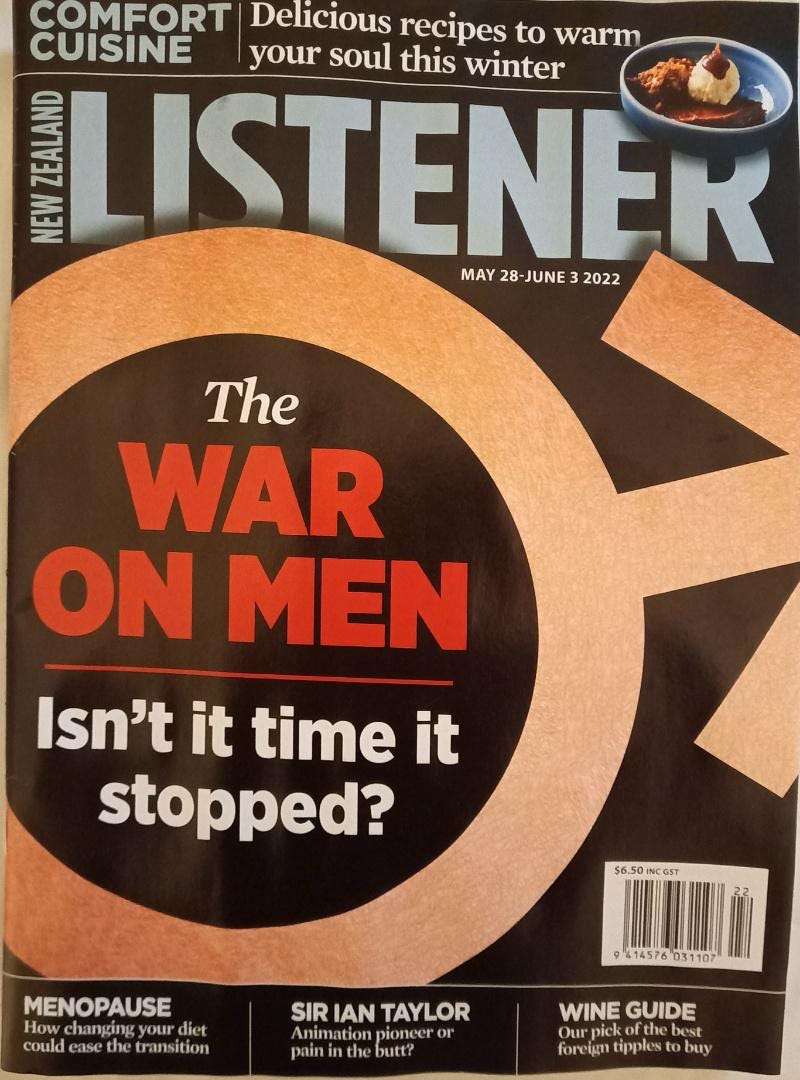 I can understand, given my very public feminism, why this man would recommend this book to me and assume that I wouldn’t already acknowledge that there are some significant challenges faced by men today. However, a few years ago I had my one and only cover story for The Listener published and the headline the editor ran with was The War on Men: Isn’t it time it stopped? Needless to say it wasn’t received well by the lanyard-wearing class. The Listener was flooded with complaints and despite having not chosen the headline myself, I was thoroughly castigated. In reality, the article was a book review and interview with the author about a book she had written on the struggles of men.