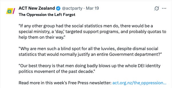 The timing of this recommendation was perfect for me to engage with a discussion started by the ACT Party in New Zealand on the ways men are being disadvantaged.